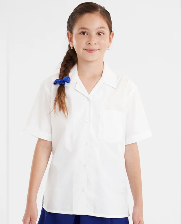 A reliable school uniform essential, this short-sleeve white blouse features a classic open revere collar, a neat single chest pocket, and a comfortable fit designed for everyday wear. Made from Polyester/Cotton.